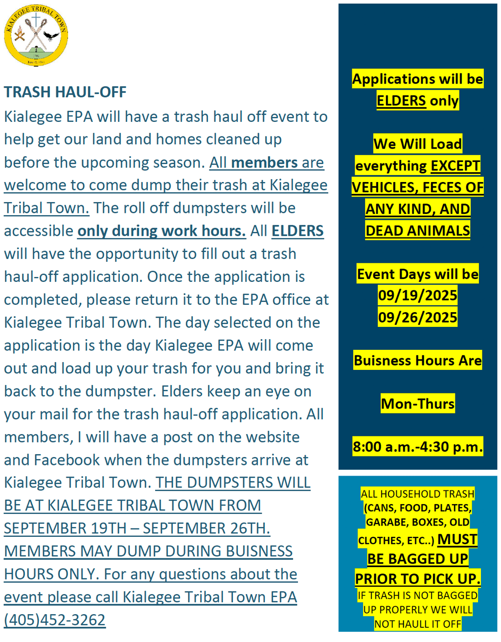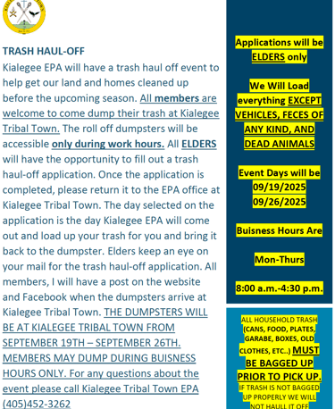 All ELDERS will have the opportunity to fill out a trash haul-off application. Once the application is completed, please return it to the EPA office at Kialegee Tribal Town. The day selected on the application is the day Kialegee EPA will come out and load up your trash for you and bring it back to the dumpster. Elders keep an eye on your mail for the trash haul-off application.