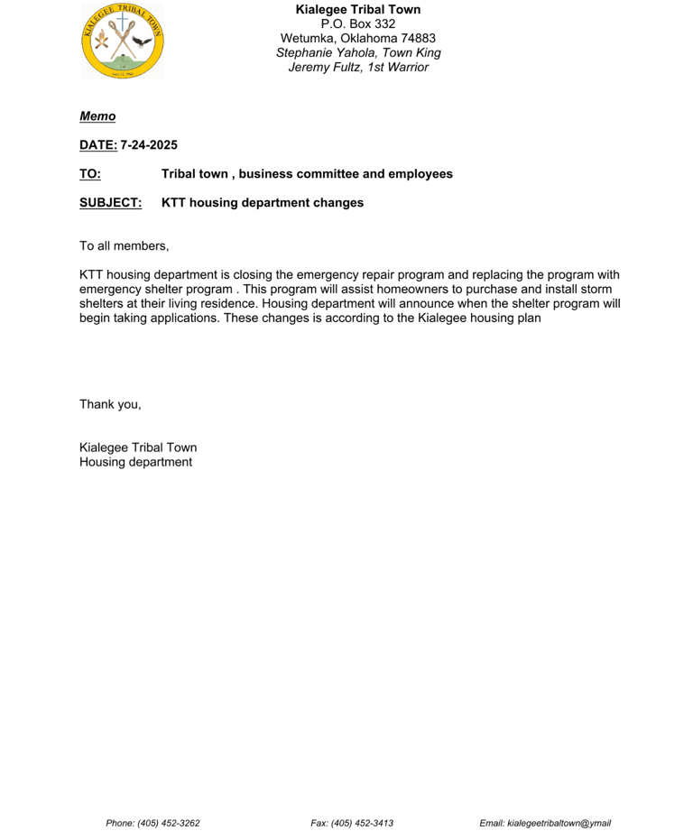 Kialegee Tribal TownP.O. Box 332Wetumka, OK 74883Phone: (405) 452-3124Fax: (405) 452-3413