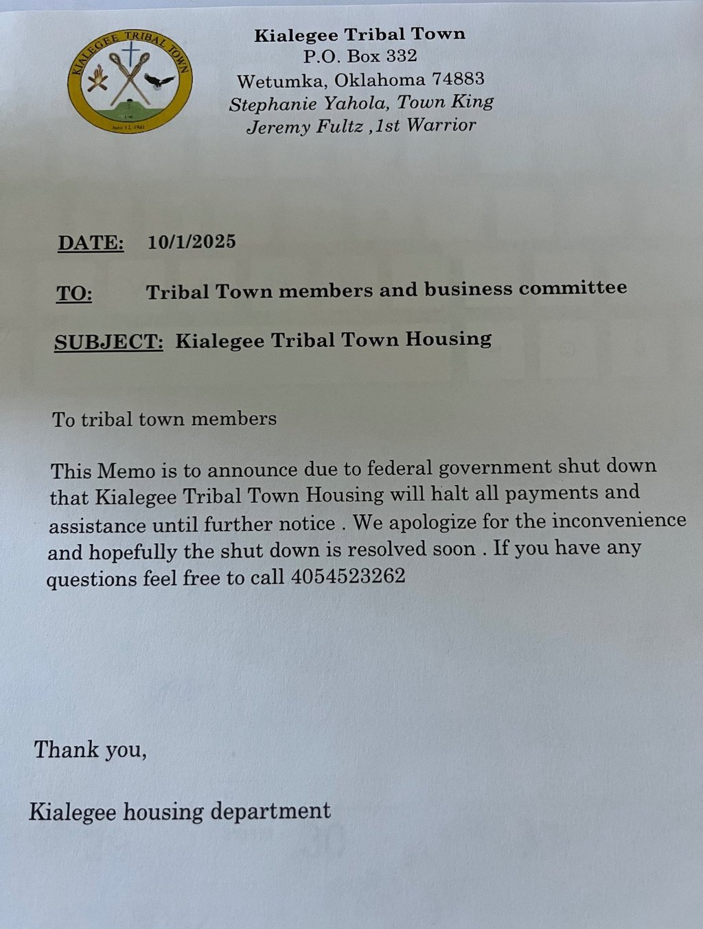 Kialegee Tribal TownP.O. Box 332Wetumka, OK 74883Phone: (405) 452-3124Fax: (405) 452-3413